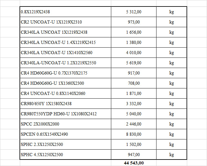 OMBORDA MAVJUD QISQA MUDDATLI SHARTNOMA RASMIYLASHTIRILADI. Sho'rlagan va zanglagan bo'lishi mumkin. 0.8X1219X2438 = 5 312,00 kg CR2 UNCOAT-U 1X1219X2310 = 973,00 kg CR340LA UNCOAT 1X1219X2438 = 1 656,00 kg CR340LA UNCOAT-U 1.4X1219X2415 = 1 380,00 kg CR340LA UNCOAT-U 1X1410X2560 = 4 010,00 kg CR340LA-UNCOAT-U 1.2X1219X2550 = 5 619,00 kg CR4 HD60G60G-U 0.7X1370X2175 = 917,00 kg CR4 HD60G60G-U 1X1360X2300 = 708,00 kg CR4 UNCOAT-U 0.8X1140X2060 = 1 871,00 kg CR980/650Y 1X1580X2438 = 3 332,00 kg CR980T550YDP HD60-U 1X1080X2412 = 5 040,00 kg SPCC 2X1000X2000 = 2 446,00 kg SPCEN 0.65X1549X2490 = 8 830,00 kg SPHC 2.3X1250X2500 = 1 502,00 kg SPHC 4.5X1250X2500 = 947,00 kg
