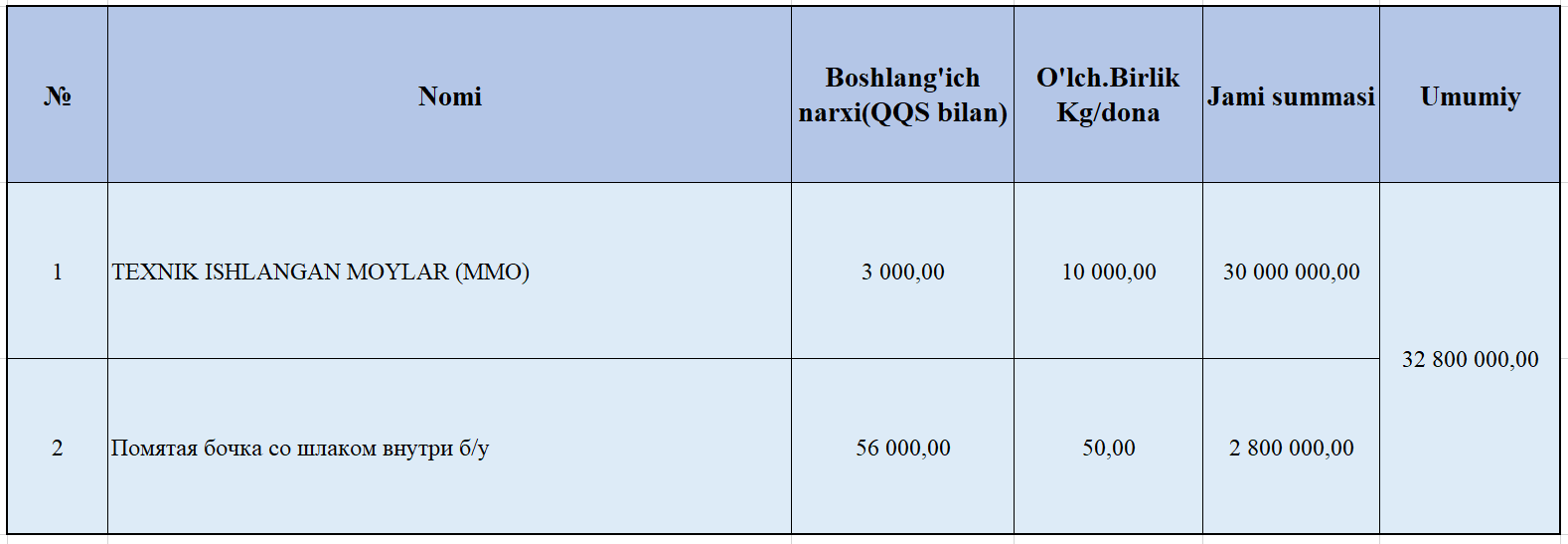 "Масло техническое отработанные (ММО)" = 10000 kg + Помятая бочка со шлаком внутри б/у = 50 dona.