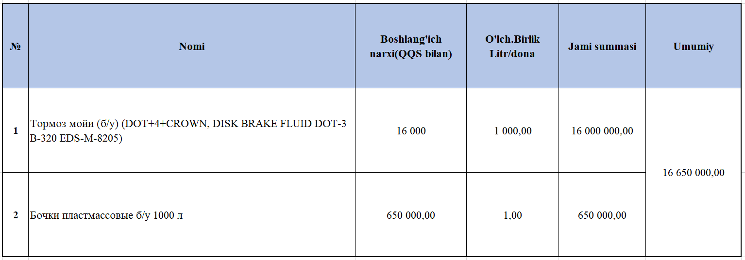 Тормоз мойи (б/у)= 1000 L + Бочки пластмассовые б/у 1000 л= 1 dona.