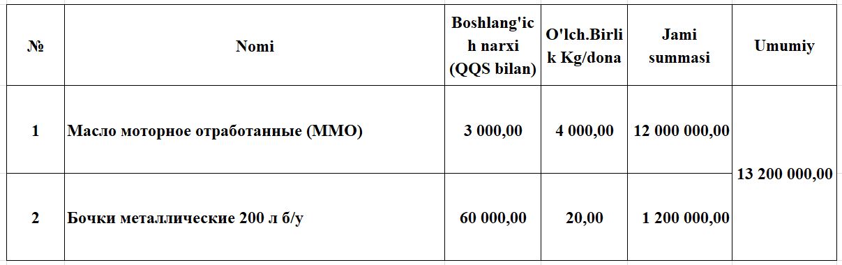 Texnik ishlangan moylar (МMО) 200L hajimdagi temir bo'chkada, kim-oshdi savdosida qatnashishdan oldin kelib ko'rish tavsiya etiladi. Texnik ishlangan moylar (МMО) ichiga suv aralashkan bo'lishi munkun.