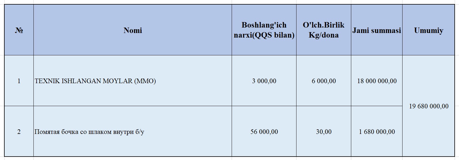 "Масло техническое отработанные (ММО)" = 6000 kg + Помятая бочка со шлаком внутри б/у = 30 dona.