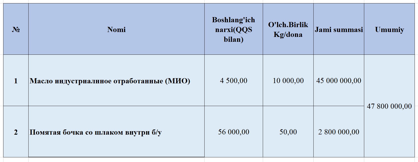 "Масло индустриалнное отработанные (МИО)" = 10000 kg + Помятая бочка со шлаком внутри б/у = 50 dona.