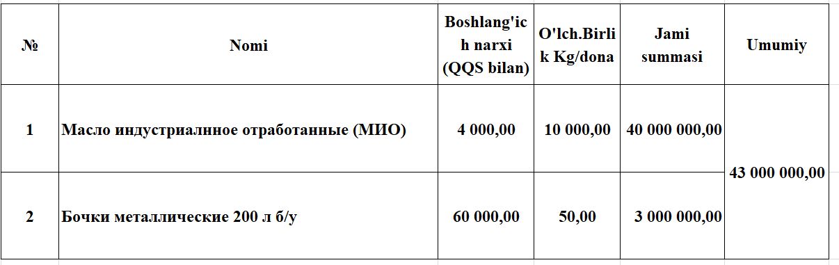 Texnik ishlangan moylar (МИО) 200L hajimdagi temir bo'chkada, kim-oshdi savdosida qatnashishdan oldin kelib ko'rish tavsiya etiladi. Texnik ishlangan moylar (МИО)ichiga suv aralashkan bo'lishi munkun.